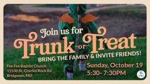 Join us for Trunk-or-Treat at Fee Fee Baptist Church! Sunday, October 19 | 5:30–7:30 PM A safe, family-friendly night of decorated trunks, ...